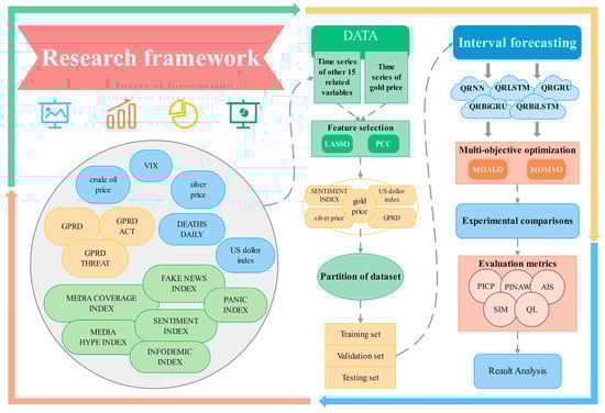 This experiment employed a meticulously crafted research framework to predict gold prices (See Figure 1). The aim of our proposed method is to function as an early warning system for potential economic challenges, offering guidance amidst market ambiguity. Given the impact of recent epidemics on gold prices, our framework emphasizes a comprehensive evaluation of factors and a prudent selection of index variables. To enhance the economic applicability of the model, two variable selection methods that screen both “hard” and “soft” indicators were employed in this study. Furthermore, we utilized quantile regression (QR) and probabilistic forecasting algorithms (QRNN, QRLSTM, QRGRU, QRBiLSTM, QRBiGRU) for the gold price data. Finally, multi-objective optimization (MOALO and MOMVO) was integrated with quantile deep learning to fine-tune the convergence and width of the forecasting interval. The optimized model enhances forecasting accuracy and significantly improves the credibility of interval forecasting. This approach enhances our understanding and assessment of economic conditions and market uncertainty.