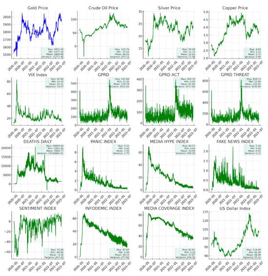 This study utilized a dataset comprising daily gold price data spanning from 1 January 2020 to 9 June 2023, covering 479 trading days. This dataset was divided as follows: 60% for training, 20% for validation, and 20% for test sets. Following an extensive literature research, 15 influencing factors were selected for this study, namely, the silver price, copper price, crude oil price, US Dollar Index, VIX Panic Index, three geopolitical risk factors (composite index Geopolitical Risk Index (GPRD), action index Geopolitical Risk Action Index (GPRD ACT), threat index Geopolitical Risk Threat Index (GPRDT HREAT)), Epidemic Deaths Daily, and six epidemic indices (Panic Index, Media Hype Index, Fake News Index, Sentiment Index, Infodemic Index, and Media Coverage Index). Silver prices, copper prices, crude oil prices, and the US Dollar Index are “hard” information, typical indicators of global economic activity. Crude oil prices are often seen as an indicator of the global economy’s health due to oil’s fundamental role in industrial production and transportation [46], and a stronger US dollar weakens the purchasing power of gold, leading to a decline in its price [3]. “Soft” information, which includes the Panic Index, Daily Epidemic Deaths, the Epidemic Index, and the Geopolitical Risk Index, reflects market uncertainty and risk perceptions. For example, the VIX Panic Index, which measures expectations of market volatility, tends to rise with market uncertainty, increasing demand for gold as a “haven” asset, and the Epidemic Index reflects the impact of global health crises, such as the new Crown Pneumonia, on the economy and market sentiment. The Geopolitical Risk Index is a composite, as geopolitical risk affects global economic stability and market confidence, which affects the price of gold, with political tensions driving investors towards safer assets such as gold. These factors have traditionally been recognized as important drivers of gold price dynamics, encompassing a wide range of economic, political, and market conditions affecting the demand for and supply of gold, thus providing a well-prepared forecast of gold price trends through a careful understanding and analysis of these factors. The gold, silver, copper, crude oil, US Dollar, and VIX panic indices are taken from the EWEB website (https://cn.investing.com/ (accessed on 18 June 2023)), the Geopolitical Risk Indexes from the geopolitical risk website (Geopolitical Risk (GPR) Index (matteoiacoviello.com (accessed on 18 June 2023))), and the epidemic indexes from RavenPack (https://coronavirus.ravenpack.com/ (accessed on 18 June 2023)). Figure 2 shows a trend chart, statistical indicators for the gold price data, and all the influencing factors.
