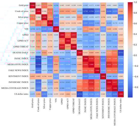 The gold, silver, copper, crude oil, US Dollar, and VIX panic indices are available on the EWEB website (https://cn.investing.com/ (accessed on 18 June 2023)), the Geopolitical Risk Indexes are available on the geopolitical risk website (matteoiacoviello.com (accessed on 18 June 2023)), and the epidemic indexes are available on RavenPack (https://coronavirus.ravenpack.com/ (accessed on 18 June 2023)).