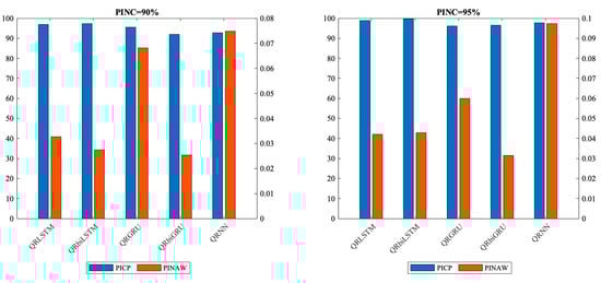 Initially, the reliability of the prediction intervals was assessed using the PICP metric. A PICP value exceeding the nominal confidence level (PINC) indicates reliable forecasting. As shown in Table 1 and Figure 3, all models exhibit PICP values surpassing the corresponding PINC values, indicating reliable prediction across all models. Notably, the QRBiLSTM model performs exceptionally well, achieving the highest PICP values at PINC = 90% and PINC = 95% (97.3384% and 99.6198%, respectively), making it the most reliable model. The QRLSTM model closely follows, with PICP values of 96.9582% and 98.8593% at PINC = 90% and PINC = 95%, respectively.