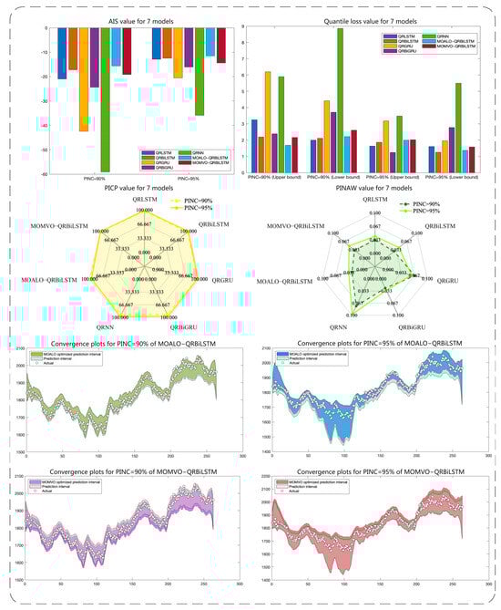In Experiment 2, the QRBiLSTM model, which demonstrated superior performance, was optimized using two metaheuristic algorithms: MOALO and MOMVO. The results obtained from these optimizations were compared with the pre-optimization outcomes. The findings are presented in Table 2 and Figure 5. For both the pre- and post-optimization models, the PICP values exceeded the designated PINC values, indicating reliable prediction intervals. When the nominal confidence level (PINC) was set at 90%, both optimization algorithms improved the PICP metrics. However, only the results optimized with the MOALO algorithm showed improvements in the PINAW value, quantile loss, and AIS. Specifically, the MOALO-optimized QRBiLSTM model achieved a PICP of 98.0989, a PINAW of 0.0254, an upper quartile loss of 2.2235, a lower quartile loss of 1.6824, and an AIS of −15.6240. This marks a significant improvement over the pre-optimized QRBiLSTM model, which had a PICP of 97.3384, a PINAW of 0.0274, an upper quartile loss of 2.1124, a lower quartile loss of 2.1961, and an AIS of −17.2341. At PINC = 95%, QRBiLSTM optimized by MOALO resulted in a slight decrease in the PICP value to 95.0570 (but still higher than the PINC value), a slight improvement in the PINAW to 0.0421, better interquartile loss values of 1.3737 (upper bound) and 1.9935 (lower bound), and an AIS of −11.5581, which is an improvement of 0.9646 compared with the QRBiLSTM. However, the PINAW value of the QRBiLSTM model corrected for the MOMVO optimization error did not decrease but increased, and although the PICP value was slightly larger compared to the MOALO optimized result, the combined PICP and PINAW, i.e., the combined metrics AIS, were taken into account in the interval prediction, and the AIS value was not only better than that of the MOALO-QRBiLSTM but also smaller than the value of QRBiLSTM before optimization, and the prediction results were not improved. In conclusion, the MOALO-optimized QRBiLSTM model (i.e., MOALO- QRBiLSTM) performs well and is the best-performing model among the probabilistic prediction models.