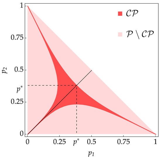 Figure 2. Parameter set of maps , with , along the bisector of Figure 1, with , and . The region of defined by the inequalities in (46a) and (46b) is shown in purple. For points inside this region, is P-divisible, while outside it is not P-divisible and displays SBFI. Notice that for increasing , the minimal distance needed to make enter the purple region by varying it into with and increases. The interval of “good” q that permits us to restore P-divisibility also reduces with increasing p, up until , which corresponds to , where it only consists of . The corresponding point lies on the centroid of .- The largest value such that is P-divisible is increasingly smaller than (and p). Thus, what also increases is the minimal departure of q from p in the second party such that is P-divisible;