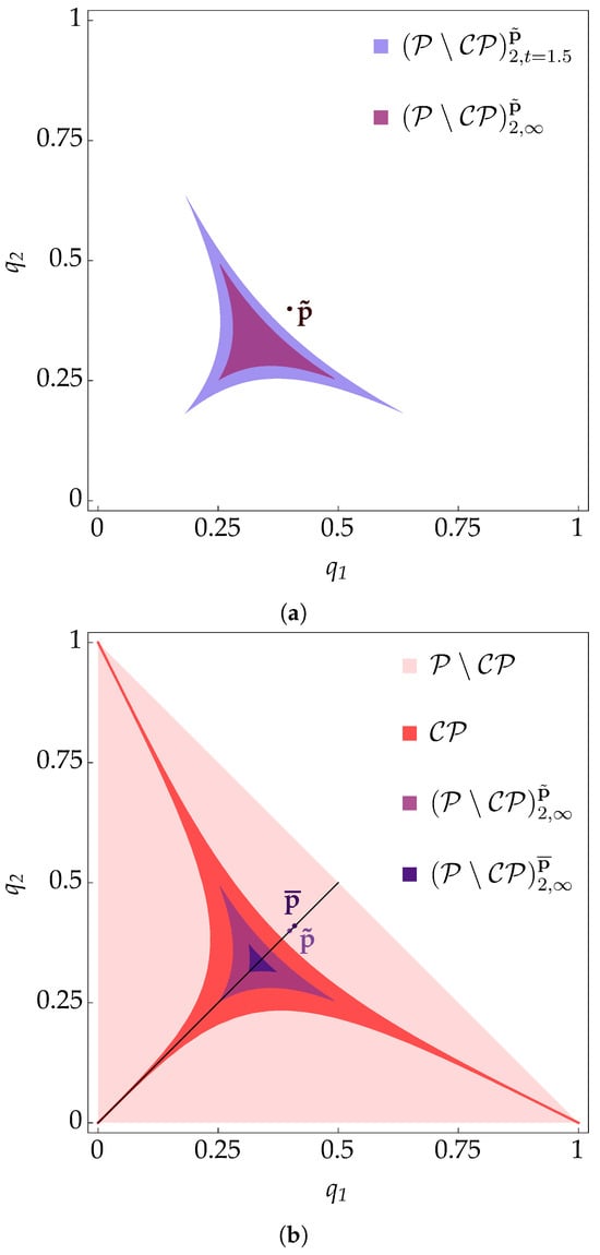 Figure 3. In (a), for fixed in , the region is displayed for and for . In (b), the same region is displayed in purple within ; it contains points q such that is P-divisible. Notice that it cannot be reached from with an arbitrarily small perturbation : a large enough variation is required to enter it, restore P-divisibility and eliminate SBFI. The same region is also displayed in dark purple for , illustrating that as moves along the line with p increasingly larger than , the size of the region decreases.In addition, for p along the line and progressively further away from , the size of will reduce, as already noted for the case. The regions for and are compared in Figure 3b.