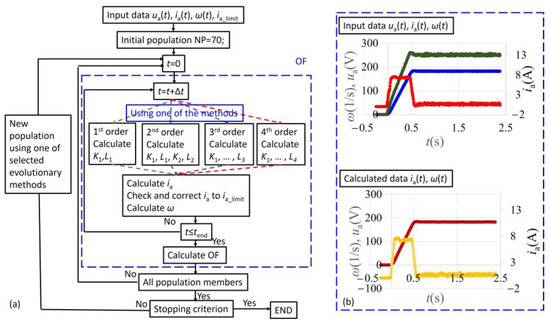 Algorithm of the parameters’ determination procedure: (a) algorithm; (b) presentation of the input and calculated data used for the OF calculation.