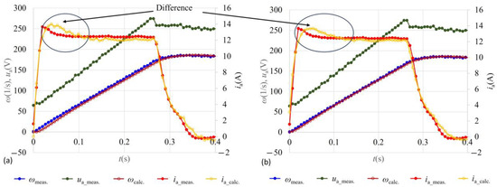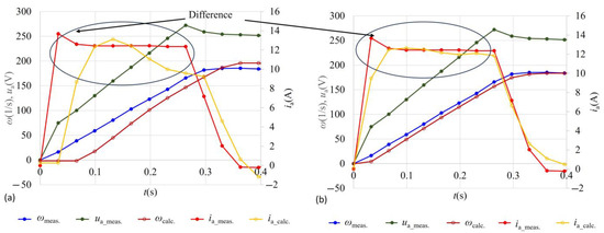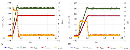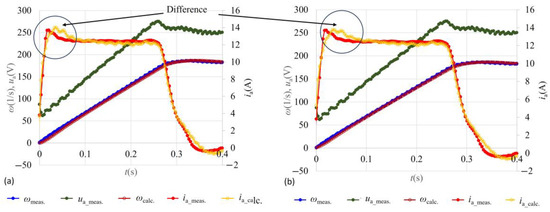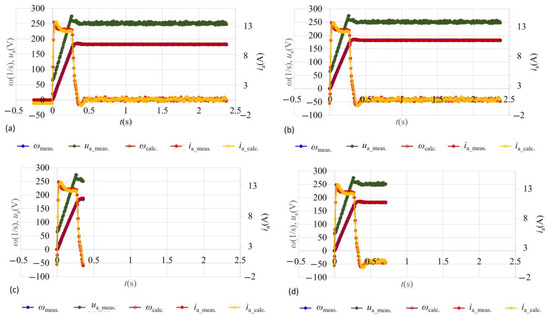 The comparison of results using four sampling times (3.3 ms, 6.6 ms, 16.5 ms and 33 ms) and four different methods used for solving of coupled differential equations were analyzed (first-order, second-order, third-order and fourth-order methods). It can be concluded that at least some measured points should be at the speed-up interval, such as in the case of 3.3 ms (Figure 8) and 6.6 ms (Figure 9). The sampling times of 16.5 ms and 33 ms were not appropriate in the case of the used drive (Figure 10 and Figure 11). The results obtained using the first-order method were the worst. The results obtained using the second-, third- and fourth-order methods were better and comparable.