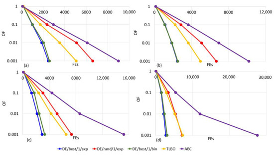 The third selected algorithm was TLBO [35,36,37,38,39,40,41,42,43], which is a recently proposed population-based algorithm, which simulates the teaching-learning process in a classroom. TLBO is divided into a Teacher Phase and a Learner Phase. In our work the TLBO implementation was used, where the duplicate elimination phase was omitted. The number of FEs consumed can be determined statistically as: FEs = 2 × population size × iterations. TLBO has no additional control parameters beside the population size.