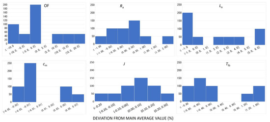 The statistical distribution of the results is presented in Figure 12, where histograms are presented for OF, Ra, La, cm, J and Tlb.