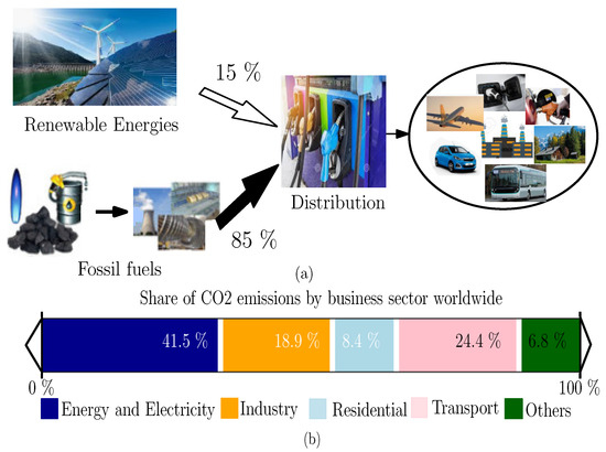 The transport market, including planes, trucks, and vehicles, is closely linked to fossil resources. Figure 1a shows that nearly two-thirds of energy consumption is oil-based, while 15% is generated from renewable energies. Figure 1b illustrates that “Energy and Electricity” is the primary source of CO2 emissions, contributing the most significant percentage. Following this, the transport sector, including vehicles, accounts for 24.4% of CO2 emissions. The World Health Organization has proven that road vehicles emit more air pollution than boats, planes, etc. In particular, gasoline and diesel are the two main sources of water and air pollution. Moreover, it has a dangerous impact on human health, which leads to serious illnesses resulting in a high mortality rate. It is absolutely clear that the unwanted emissions of these petrol vehicles seriously threaten human societies and climate stability [1,2,3,4,5].