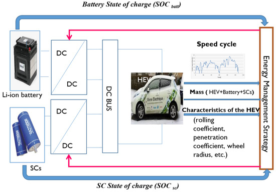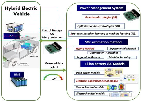 Therefore, a second transition targeting hybrid-source electric vehicles (HEVs), which consists of a set of energy storage systems (ESSs), may be presented as an alternative solution to improve vehicle autonomy and battery life [12]. This hybridization combines the higher energy density characteristics of the Li-ion battery and the rapid capacity of the SC for energy storage with a virtually unlimited number of charge and discharge cycles [13]. Combining a Li-ion battery primary source with the SC secondary source adds greater HEV range but increases the complexity of the power management system (PMS). Therefore, a compromise between these two important factors should be taken into consideration. Moreover, a good estimation of the state of charge (SOC) of these two energy sources makes it possible to optimize the PMS and the safety of the HEV.