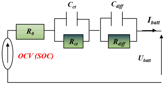 Thus, Thevenin’s model with two branches () is adopted to model the studied Li-ion battery, as presented in Figure 4 [26]. In fact, Thevenin’s model includes four main parts: