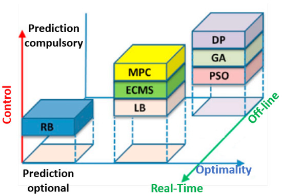 - Rule-based strategies (SR) utilize the expertise of engineers, translating it into executable rules that govern the powertrain’s control signals. These strategies are designed to meet specific performance criteria and consider the operational constraints of vehicle components, including the state of charge of energy storage systems (ESSs). SRs are known for their simplicity and effectiveness in real-time supervisory control but may lack adaptability under varying load conditions. This necessitates fine-tuning of vehicle parameters to align with specific performance targets.