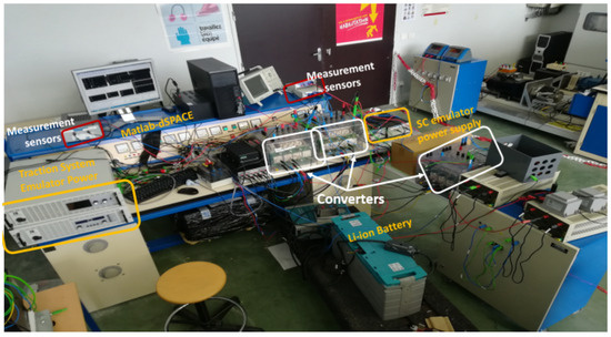 Figure 10 presents the synoptic of the test bench, which is composed of converters, a lithium-ion pack, an SC pack emulator, and another emulator to simulate the charging current of the electric vehicle (see Table 2).
