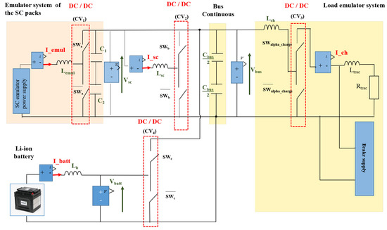 Two converters (CV1 and CV2) are included in the proposed hybrid design to regulate the power exchange between the SC emulator supply and the DC bus. To mimic the behavior of the SC during the load phase, the first converter, CV1, is used. While the discharge phase of the SC will be controlled by the second converter (CV2). On the other side, two bidirectional converters are used to connect the Li-ion battery and charge emulation system to the DC bus (CV3 and CV4). The CV3 converter provides the traction current required by the load, dissipating the power in a resistor. A programmable “brake supply” simulates the braking phase of the process.