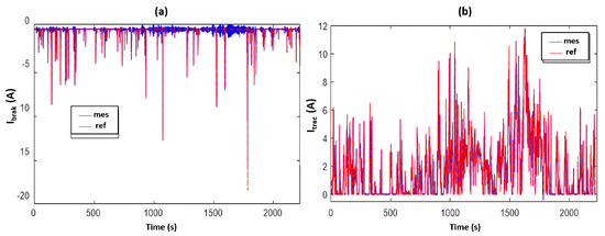 - The load current, resulting from traction and braking currents, is displayed in Figure 12a,b, respectively. Both figures unmistakably demonstrate that the measured currents closely follow the reference signals due to proper regulation functioning.