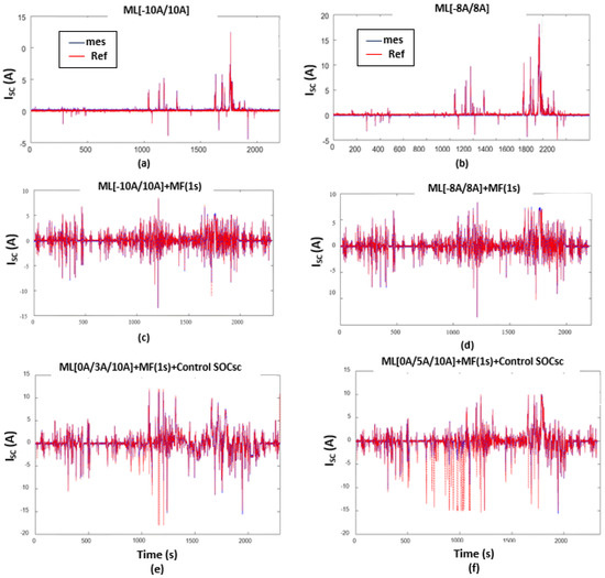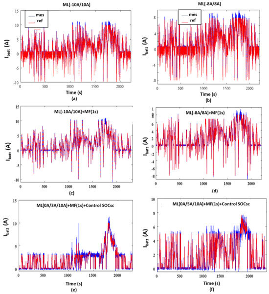 Figure 13. Battery currents (A): (a) ML[−10A/10A]; (b) ML[-8A/8A]; (c) ML[−10A/10A] + MF(1s); (d) ML[−8A/8A] + MF(1s); (e) ML[0/3A/10A] + MF(1s) + Control ; (f) ML[0/5A/10A] + MF(1s) + Control .