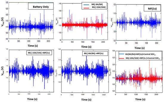 Figure 15. Bus voltage (V). - Calculation of SC and Li-ion battery effective currents, along with reduction rates for various scenarios, is summarized in Table 3. Note the maximum constraints applied to the battery in the case of a single source (no hybridization), with an effective current of 4.089 A. In EV operation with a single source, the battery experiences charge/discharge peaks, while these peaks decrease by varying percentages for the six management scenarios (EV to hybrid source). Single-source EV operation is more “aggressive” on Li-ion cell packs, leading to a rapid decline in battery life.