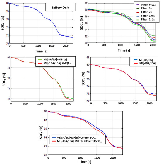 - We implemented the MF strategy with five different values of (0.01 s, 0.07 s, 0.1 s, 1 s, and 2 s) to assess the impact of the time constant on power sharing between the Li-ion battery and SC. remains constant throughout the ARTEMIS driving cycle. After experimental implementation, Figure 17 depicts the evolution of the battery’s state over time. A comparison of practical results indicates that Figure 17 corresponds to 1 s, leading to a significant reduction in current demands on the battery compared to other time constants, with the lowest battery state of charge.