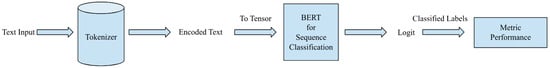 The overall process is shown in Figure 1. Initially, we processed the text input through the tokenizer tailored for the corresponding model. Subsequently, the encoded text was transformed into a tensor dataset, which served as the input for the classification model. Logits generated by the classification model, then, were converted into classified labels, which were finally assessed by metric performance.