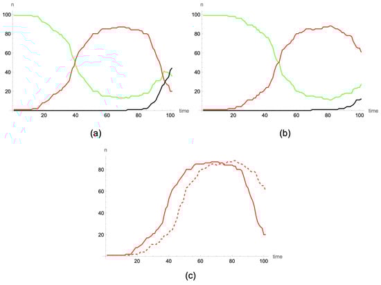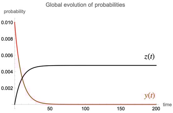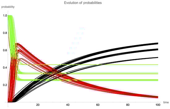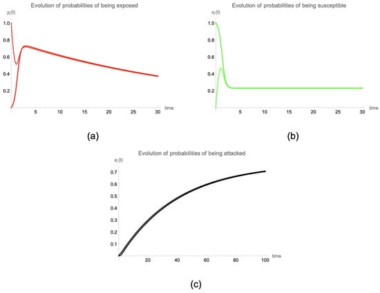 If the complete graph is considered, the evolutions of the probabilities of being susceptible () exposed (), and attacked () are as shown in Figure 6.
