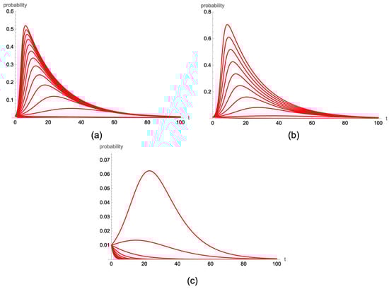 In Figure 5a, some simulations are shown when the initial conditions are and , and the values of the epidemiological coefficients are , , and . It can be observed that as the infection force increases, the peak of the probability of being exposed also increases. A simple calculation shows that if , the basic reproductive number is so that if , this threshold coefficient is greater than 1, and obviously, the probability curve is monotonically increasing towards the maximum (it will later decrease). On the other hand, in Figure 5b, a similar analysis is carried out, varying, in this case, the numerical value of the recovery coefficient , and assuming (the rest of the parameters are the same as in the previous case). It is shown that as the recovery coefficient increases, the basic reproductive number decreases: for , it takes the value ; for , it is ; and for , it falls below one to . This indicates that the curves corresponding to the probability of being in the exposed state tend to flatten as the recovery coefficient increases. Finally, in Figure 5c, the simulations obtained when varying the attack coefficient are shown. In this case, it is assumed that and . Here, as in the previous case, as the attack coefficient increases, the basic reproductive number decreases, finding (in this specific example) that the critical threshold appears at .