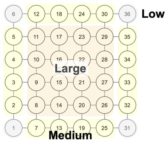 - As for all , the behavior of the probabilities of being attacked is similar to that of the probabilities of being susceptible, that is, three types of devices can be derived from the evolution considering the value of : (low values), (medium values), and (large values). The spatial distribution of these three types of nodes within the network is shown in Figure 9.