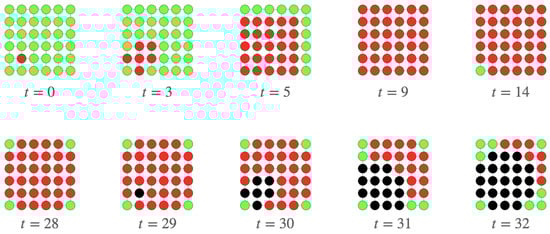 In Figure 10, the spatio-temporal spreading of the specimen of malicious code on the grid network is shown at different steps of time. In this simulation, the color of each node is assigned considering the greatest probability: or (that is, green, red and black for nodes whose highest probability is that of being susceptible, exposed and attacked, respectively).