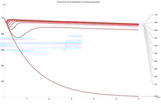 In Figure 2a, the global evolution of the different probabilities of a (general) device state is shown (susceptible probability in green, exposed probability in red, and attacked probability in black). Note that as , then the probability of being exposed initially increases to a maximum , which is reached at (obviously, as you can see in Figure 2b, this occurs when the replacement number decreases to 1, that is, ), and then this probability decreases to . On the other hand, the probability of being attacked monotonically increases to , and the probability of being susceptible monotonically decreases to .