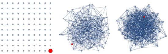 Specifically, in Figure 15a, the evolution of the number of devices with large probability of being susceptible (green), exposed (red) and attacked (black) when the “zero patient” is determined by the node with highest degree centrality is shown. The same simulation but considering as “patient zero” the node with the minimum degree centrality is presented in Figure 15b. Finally, in Figure 15c, the comparison between the simulations when the temporal evolution of the number of exposed devices is only represented is shown (the red dashed line stands for the case with the minimum degree centrality). In Figure 16, the spatial distribution of these nodes within the network is illustrated for three specific steps of time , and : the left column represents the evolution of the system when “patient zero” is the highest-degree node, whereas the right column stands for the evolution when “patient zero” is determined by the minimum degree centrality. Note that the growth of the number of devices with a higher probability of being exposed is faster in the first case (when the initially exposed node has the highest degree centrality) than in the second case, reaching its maximum earlier. However, in the end, both curves collapse to zero as the states of different nodes reach their equilibrium points.