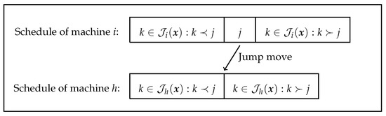 Figure 1 illustrates a Jump move of a schedule denoted as . In this scheme, job j, currently assigned to machine i, is moved or reassigned to machine h. The figure also indicates the sets of jobs scheduled before and after job j on both machines. Consider as the reduction in the total weighted completion time when job j is excluded from machine . Furthermore, let denote the increase in the total weighted completion time if job j is reassigned to machine h. Thus,