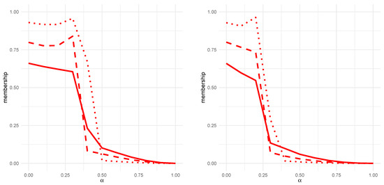 It is important to highlight the effects of different choices of the spatial component. When we assume that the maximal spatial distance between two units corresponds to a zero correlation in the Gaussian model (Figure 3, on the left), the membership degree of unit 1 to its natural temporal cluster tends to decline sharply only for close to . Instead, the decline comes earlier when the maximal spatial distance between two units corresponds to a correlation equal to in the Gaussian model (Figure 3, on the right). We notice that this latter choice was also adopted in [11] when the Fréchet family of copulas was used.