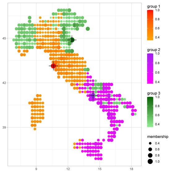 In this section, we apply the fuzzy-PAM clustering algorithm on time series representing the summer temperature maxima of Italy from 1971 to 2023. The data have been downloaded from the Climate Data Store (https://cds.climate.copernicus.eu/, accessed on 1 September 2023) which collects global climate and weather data of the past eight decades. Specifically, we focus on JJA (June–July–August) maxima of daily maximum temperatures over a grid of the Italian land. The considered data are grid points. Similarly to [62], we detrend the observed temperatures from the long-term warming trend, following a two-step procedure. First, we remove the multi-year climatological average from the daily temperature maxima within the dataset. Then, from these temperature residuals, we remove the 92-day running average. After this detrending process, we consider the maximum value of each season for each grid point, leading to a collection of time series of length . Given the set of detrended time series and the geographical locations, we compute the temporal and the spatial dependencies, as described in Section 4. Specifically, for every pair of , , we use the estimation of the normal score correlation to compute the temporal correlation matrix as in step 1, and we use the normalized distances to compute the spatial correlation matrix according to step 2. Initially, we consider the fuzzy-PAM algorithm applied to the dissimilarity given in (16) for representing the pure temporal case. We select the number of clusters via the fuzzy silhouette (FS) index [63], a suitable measure for the fuzzy clustering algorithm that is computed as the weighted average of the individual silhouettes. The better the units are assigned to the clusters, at the same time as minimizing intra-cluster distance and maximizing inter-cluster distance, the higher the value of FS. We represent the obtained clusters in the pure temporal case () in Figure 4. From the maximization of the FS we have that the optimal number of clusters is .