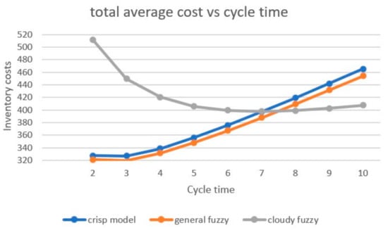 On the basis of the results obtained, Figure 6 shows that the average inventory costs in the case of the general fuzzy model are inferior to the crisp and cloudy fuzzy models. However, a numerical study shows the superiority of the cloudy fuzzy model compared to the general fuzzy model.