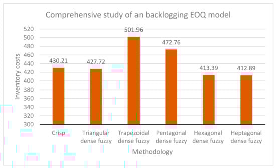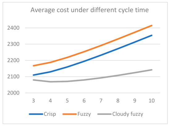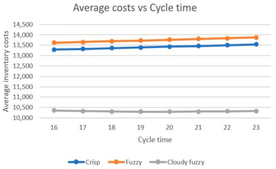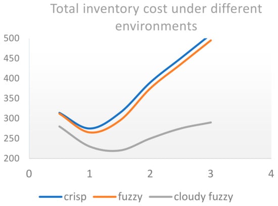 By analyzing Figure 5 based on the results of Shah and Patel’s [] study, it can be seen that there is not much difference between the optimal solutions in a crisp and fuzzy environment, but a significant difference can be observed in the case of the cloudy fuzzy model.