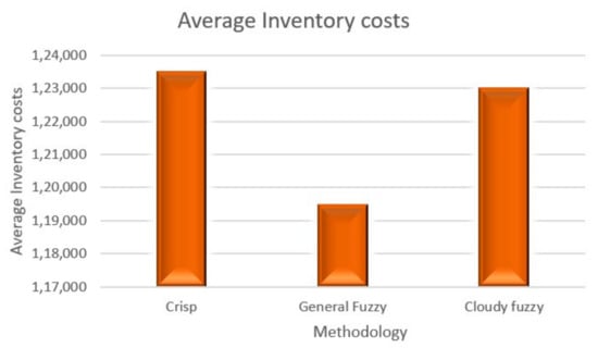 Figure 4, obtained from the results of ref. []’s study shows that there is a substantial difference between the average inventory costs of the crisp and general fuzzy methods and the cloudy fuzzy model. The lowest value of inventory costs is given using the cloudy fuzzy model, hence making it a better choice.