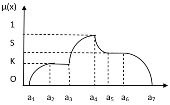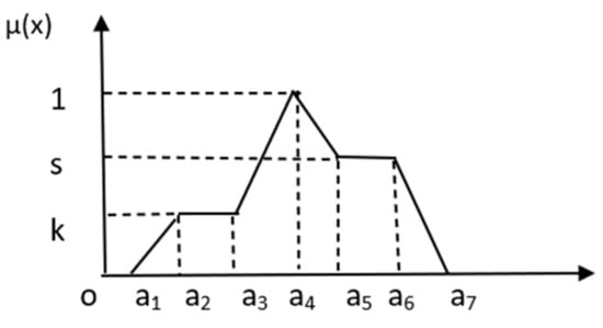 Maity, De, and Mondal [] introduced the concept of linear (Figure 9) and as well as non-linear (Figure 10) for both symmetric and asymmetric heptagonal dense fuzzy numbers. They said, “A fuzzy number A = (a1, a2, a3, a4, a5, a6, a7) is said to be Heptagonal fuzzy number” if it satisfies the following conditions: