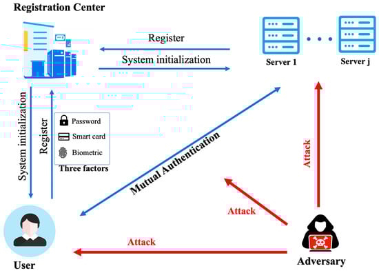 According to the Dolev–Yao model [] and the security requirements of multiserver authentication, we define the adversary model as follows: