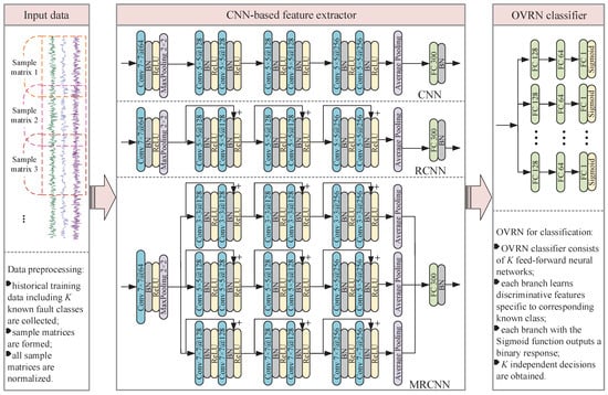 A new deep learning framework based on CNN-based feature extractors and an OVRN classifier is proposed for known and unknown health states recognition. This work allows CNN-based models such as conventional CNNs, RCNNs, and MRCNNs to overcome limitations when faced with new observations that are not part of the training set. The network structures adopted for the CNN-OVRN, RCNN-OVRN, and MRCNN-OVRN are shown in Figure 2. All deep learning models in experiments were trained on an NVIDIA GeForce RTX 2080 Ti GPU and an Adam optimizer with a learning rate of 0.0005 and 50 epochs. These models are implemented based on an open-source deep learning framework named Apache MXNet.