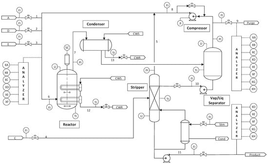 The Tennessee Eastman process (TEP) is a simulation program developed from an actual chemical plant that has been widely employed in the verification of various health states recognition methods []. The TEP consists of five major units: reactor, condenser, compressor, separator, and stripper, as shown in Figure 3 []. The whole process can be described as: four gaseous reactants A, C, D, E and a small amount of inert B are sent into the reactor to form liquid products F, G, and H.