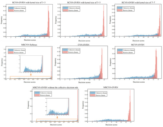 Furthermore, the effectiveness of the proposed methods is demonstrated by comparing the distribution histograms of decision scores for known and unknown health states, as shown in Figure 5. Greater separation between the histograms of known states (red part) and unknown states (blue part) indicates a higher recognition ability for unknown states. The proposed CNN-OVRN, RCNN-OVRN, and MRCNN-OVRN can obtain clear separation results between samples of known and unknown states with small overlap, which benefits from the the collaboration of CNN-based feature extractors and the OVRN classifer. The MRCNN-OVRN provides the best separation histogram, which is reflected in the fact that the decision scores of samples from an unknown state are concentrated around small values. Compared with the MRCNN-OVRN, the MCNN-OVRN without residual learning has a larger overlapping area of the distribution of decision scores due to its limited ability to learn deep features. For MRCNN-Softmax and the MRCNN-OVRN without the collective decision rule, the maximum posterior probability output by the softmax layer and sigmoid layer is taken as the decision score, respectively. The softmax layer, which provides high confidence scores for unknown samples, results in a poor ability to distinguish between known and unknown states by identifying the state with the highest relative likelihood among all known states. The MRCNN-OVRN without the collective decision rule provides slightly lower decision scores than MRCNN-Softmax since each node of the output layer provides an independent decision to distinguish whether a sample belongs to this state or not.