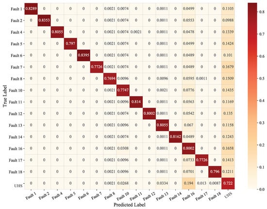 For one of ten experimental runs, Figure 6 shows the confusion matrix for test samples of 15 known health states and the unknown state, where the rows and columns represent true and predicted states. In this confusion matrix, one can clearly see how all the test data are assigned by the MRCNN-OVRN. It can be observed that the MRCNN-OVRN can achieve the recognition of most unknown samples while maintaining satisfactory recognition performance for known states. This is mainly due to the multi-scale feature learning ability of the MRCNN and the complex decision boundary established by the OVRN classifier. It can also be found that a small number of samples of known states are misassigned to states 8, 10, 13, and 16. In addition, there are also samples that belong to known health states that are considered unknown. To enhance the discriminative performance for unknown states, the proposed method establishes a strict and compact decision boundary to reject new samples as unknown states. Therefore, under the collective decision rule, some samples of known states are inevitably misidentified as unknown states. For the 14,115 known class sample matrices and 4705 unknown class sample matrices shown in Table 1, the computational cost (CPU time) of the MRCNN-OVRN is approximately 75.81 s. The low computational cost demonstrates the ability of the proposed method to achieve real-time fault classification.