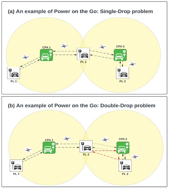 The double-drop problem is inspired by the fact that there are power banks available that can charge two EVs fully. Analyzing the battery capacities of 371 EV brands found on the EV database website (https://ev-database.org/, accessed on 6 November 2023), the median battery capacity for 80% charge is 56.8 kWh. While there are power banks capable of storing sufficient energy for fully charging a single EV (FreeWire Mobi has a capacity of 80 kWh), there are others (Freewire Boost 200 has 160 kWh capacity) that provide energy that can charge two EVs fully. Figure 2b shows an example where a drone from CPA2 can serve two EVs in PL3 and PL2, consecutively (represented in red dashed arrows), as the autonomy may allow it, and the power bank deployed is capable of fully charging two EVs before needing replacement.
