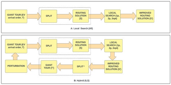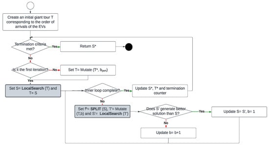 The pseudocode for the Hybrid heuristic is presented in Algorithm 2. Initially, the incumbent giant tours consist of the improved TSP tour T generated from local searches on the order of EV arrivals, and the tours generated by perturbing (mutation of b pairs of nodes) T (line 15). Local searches on the above tours are carried out to improve the solution (lines 11 and 16). The best-improving tour () is the next incumbent tour. is perturbed to create the next generation of giant tours (lines 9 and 15): the pair of nodes within are mutated (pairwise exchange) to generate T, which is subsequently improved through local search (lines 11–12); and the remaining giant tours are constructed through a further exchange of b pairs of nodes within the updated T and performing local searches (line 15–16). This is repeated until there is no more improvement in the solution for a consecutive number of generations (line 6).