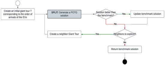 The flowcharts for the implementation of the All (local search) and the Hybrid (iterated local search) heuristics are presented in Figure 4 and Figure 5, respectively. The split algorithm, which returns a POTG solution, is the main component embedded within the framework and depicted in a gray box. We further point out that the local search procedure (as depicted in Figure 4) is embedded in the Hybrid heuristic, as it iteratively improves the solution quality through the same local search technique.
