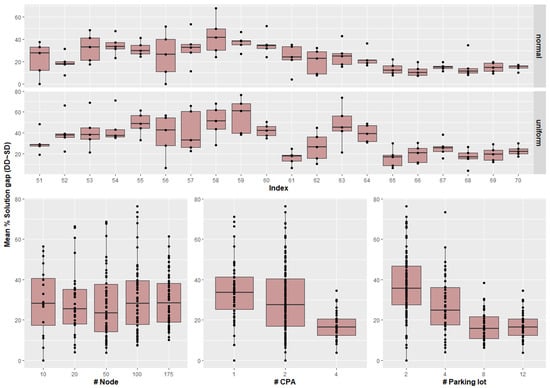The distribution determines the location of the parking lots (PL) around the CPAs. The x and y coordinates of the CPAs for both distributions are uniformly distributed between −50 and 50. To generate the parking lots, we use the following scheme. For the uniform distribution scenarios, the x and y coordinates of the parking lots are uniformly distributed between −80 and 80 and then placed around its serving CPA. For the normal distribution scenarios, the parking lots are normally distributed around its serving CPA. This is performed by generating a which is uniformly distributed between 0 and , and a radius (r) that is normally distributed with = 40, = 10, a maximum value of 80, and a minimum value of 0. The coordinates of the parking lots correspond to (, ) around the serving CPA. In all cases, it is ensured that the parking lots are located not more than 100 units from the serving CPA. The consideration of the uniform instances is to emulate the geography of a semi-urban city, where the parking lots are uniformly distributed across the region. For the normal instances, it would mimic a densely populated city with more parking lots located close to the city center or other busy parts.