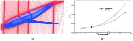 The results of robust optimization: (a) The geometry of a wing; (b) The comparison of results of drag coefficient between single-point optimization and robust optimization [13].