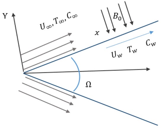 The investigation of magnetohydrodynamic (MHD) boundary layers has captivated the interest of diverse scholars in recent decades due to its extensive relevance across industrial and technology domains. The presence of magnetic particles within a fluid has the potential to alter its magnetic characteristics. The presence of MHD in fluid increases the heat transfer coefficient. This heat transfer enhancement has various applications, i.e., cooling in electronics appliances, nuclear reactors, and many industrial processes. Fluid transportation systems can use MHD to reduce fluid friction in pipelines and channels, which results in energy savings. MHD can be used to manipulate electrically conductive fluids inside biological systems to create medical devices like drug delivery systems and diagnostic tools. MHD sensors can identify fluid characteristics like velocity, conductivity, and composition, providing real-time data for numerous industrial and scholarly applications. Yih [12] and Chamkha [13] delved into a numerical examination of the impact of MHD on flow scenarios involving viscous fluids over non-isothermal wedges. To explore further uses of MHD in the transport phenomena of fluid, see Refs. [14,15,16,17].