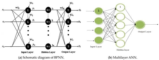 They are basic nonlinear function approximations. ANNs derive their robustness and flexibility from their modular structure, which uses the neuron as the fundamental building unit, mimicking the neurons present in the human brain. An input is given to each neuron, which then processes it through an activation function to produce an output. Combining multiple neurons can result in the creation of various structures that convey information about the issue and the type of data. In neural network (NN) topologies, input layers receive the data, while output layers provide predictions. Nonlinear optimization techniques, i.e., backpropagation, are used to determine the network weights. This approach is used to enhance the uniformity and accuracy of the model’s predictions. The neurons in artificial neural networks (ANNs) are arranged in layers. In a neural network, each layer’s neurons receive input from the previous layer and transmit their output to the next layer. The performance of the suggested Eyring–Powell fluid model is investigated by LMS-BPNN. This analysis involves the fitness function, MSE, regression, and error histogram with the applications of the ‘nftool command’. For implementing the proposed LMS-BPNN approach, the results concerning , , and profiles for inputs ranging from 0 to 3 exhibit considerable dispersion. The dataset is then partitioned into training (80%), validation (10%), and testing (10%) subsets (Appendix A). Figure 2 illustrates a schematic representation of a backpropagation neural network (BPNN) featuring n input nodes, r output nodes, and a solitary hidden layer comprising m nodes, whereas Figure 2b shows the multilayer ANN with . It means that we have neurons in the hidden layers. Every connection linking the nodes possesses an assigned weight. The input nodes are characterized by a transfer function of unity, while the hidden and output nodes employ sigmoidal S(.) and activation functions, respectively (for detailed analysis of these functions, see Ref. [30]). The net input as shown in Figure 2a, is provided by the equation below: