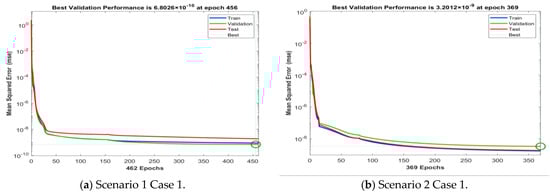 The AI-based LMS-BPNN framework has been developed to analyze the results of pertained parameters of interest (angle of inclination, , , , , , ) for Eyring–Powell fluid flow over a porous shrinking wedge with nonlinear thermal radiation. By employing the LMS-BPNN framework, researchers can gain a deeper understanding of the complex interactions between fluid dynamics, heat transfer, and chemical reactions in the context of Eyring–Powell fluid flow over porous shrinking wedges with nonlinear thermal radiation. There are seven different scenarios which consist of three different cases of pertained parameters of interest as shown in Table 1. To validate the scenarios’ data, the correlation index (), MSE, error histogram, regression analysis, and function fit are defined. The mean squared error (MSE) is a measure of error in statistical models that assesses the average squared difference between numerical and predicted values. The MSE is used to evaluate the quality of a model, with a smaller MSE indicating a better fit of the model to the data. Figure 3 and Figure 4 demonstrate the evaluation of performance and the examination of errors using histograms for the different scenarios (Scenarios 1–7) as shown in Table 1. In Figure 3a–g, it is noticed that the MSE is approximately for various scenarios as presented in Table 1. The graphical depiction of the distribution of errors between the observed and predicted approximate values in a model is called an error histogram. It aids in comprehending the model’s performance and spotting possible problems like overfitting or underfitting. Figure 5 depicts regression analysis for different scenarios with LMS-BPNN. It is important to remember that the fitness function must be properly developed to represent the objectives of the neural network training. The efficiency of the training process can also be affected by the optimization algorithm selection (i.e., LMS-BPNN) and its settings. Figure 6 represents the function fit for Scenarios 1–7 with Case 1. It is found that the function is best fitted with an approximate error analysis of . Table 2 displays the convergence of labeled data for the proposed algorithm of LMS-BPNN for the first solution of the Eyring–Powell fluid for Scenarios 1–7 in terms of error analysis for different portions of divided data, iterations, and . The best curve for the first solution of the seven scenarios is obtained at 462, 369, 642, 542, 215, 209, and 286 epochs, while the performance against these epochs/iterations is 8.67 × 10−10, 1.64 × 10−9, 1.03 × 10−9, 9.35 × 10−10, 8.56 × 10−10, 1.08 × 10−9, and 6.97 × 10−10, respectively.