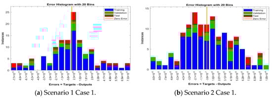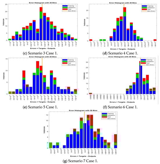 Error histogram for the first solution of Scenarios 1–7 for Case 1 with intended LMS–BPNN.