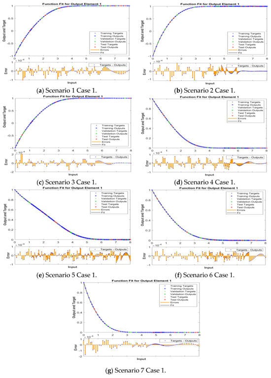 The tabulated values of and the gradient for the first solution of the seven scenarios are shown in Table 2. These values are [1.0 × 10−9, 1.0 × 10−9, 1.0 × 10−9, 1.0 × 10−10, 1.0 × 10−9, 1.0 × 10−9, and 1.0 × 10−10] and [1.36 × 10−8, 9.97 × 10−8, 9.99 × 10−10, 9.94 × 10−8, 1.36 × 10−7, and 9.95 × 10−9]. The results indicate that LMS-BPNN consistently exhibits efficient convergence in all scenarios related to Eyring–Powell fluid flow over a diminishing wedge. The investigation of regression analysis is displayed in Figure 5a–g for Scenarios 1–7 of Eyring–Powell fluid flow over a porous shrinking wedge. Regression analysis serves as a means to explore correlations within the data. In Figure 5a–g, the correlation coefficient () is observed to be at unity, indicating an optimal model fit. When scrutinizing the numerical data sheet, the correlation coefficient () closely approximates unity, lending support to the efficacy of LMS-BPNN in formulating an Eyring–Powell fluid flow over a shrinking wedge. These coefficients assess the model’s fit quality and validate the modeling accuracy. Figure 6a–g display the function fit for the proposed model and it is noted that the function fits the model asymptotically.